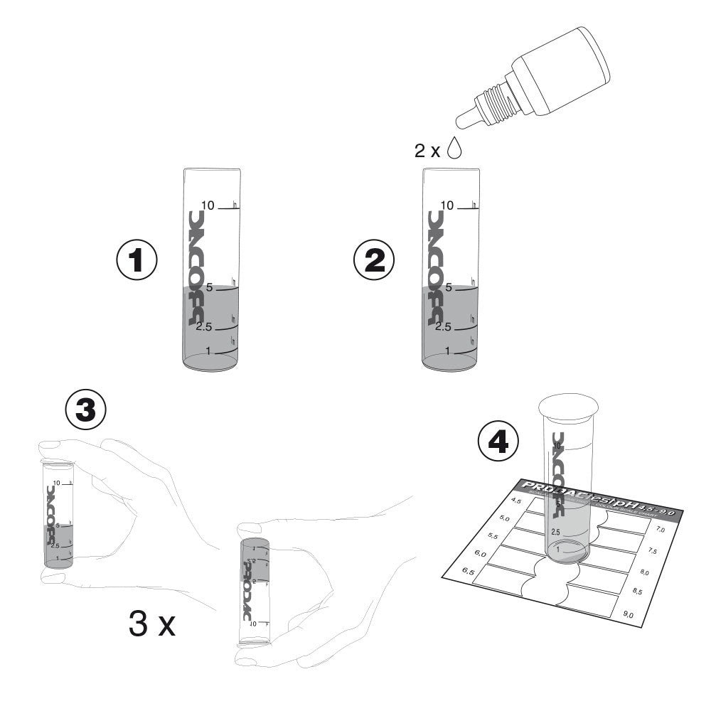 ATTENZIONE: il valore pH ottimale per i pesci d'acqua dolce è tra 6.8 e 7.0, se è inferiore, è necessario innalzarlo fino a livello di sicurezza usando un prodotto specifico tipo MUTAPHI D di PRODAC. Pulire la provetta dopo l'uso, chiudere bene i contenitori dei reagenti e conservarli in luogo fresco, asciutto e al riparo dalla luce. Tenere il prodotto lontano dalla portata dei bambini.