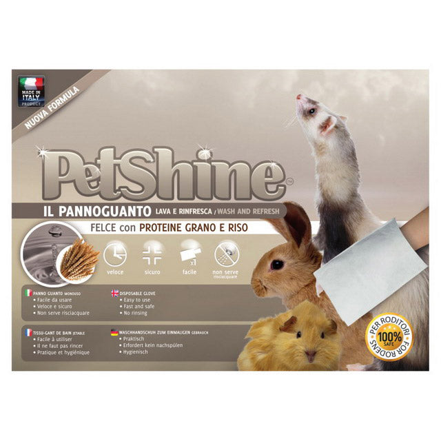 Petshine pannoguanto è imbevuto di detergente delicato non schiumoso e non richiede risciacquo.