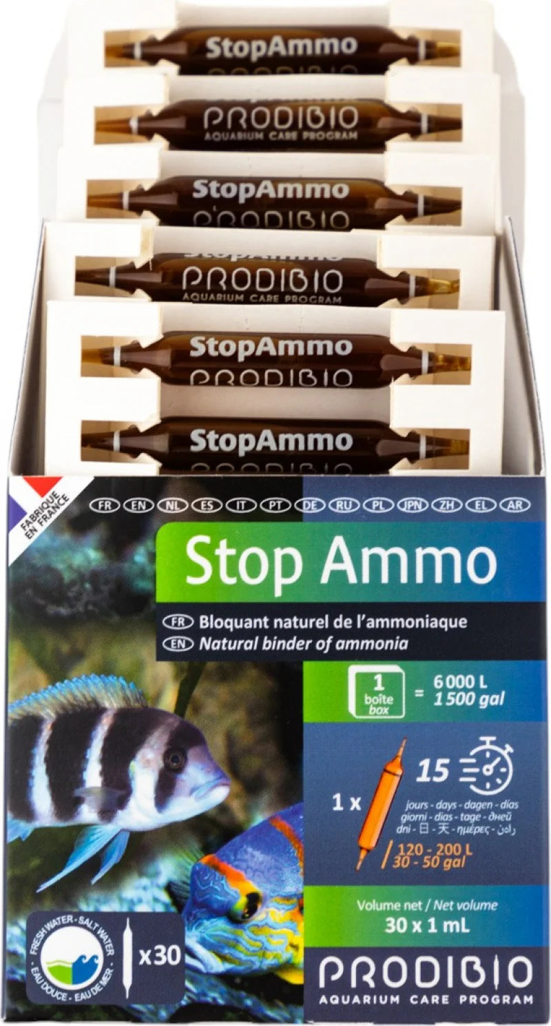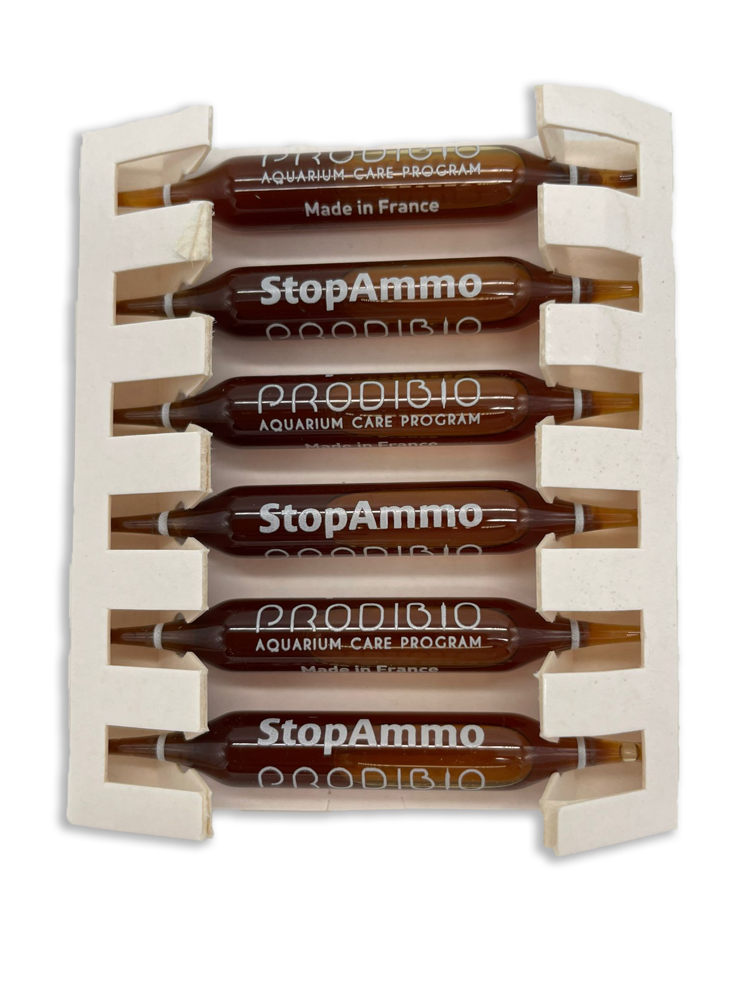 La proprietà di STOP AMMO è dunque quella di unire principalmente l'ammoniaca nelle acque d'acquario, d'allevamento e/o di trasporto, per ridurre o evitare i danni causati dall'ammoniaca non ionizzata NH3 e per limitare la produzione di nitriti.