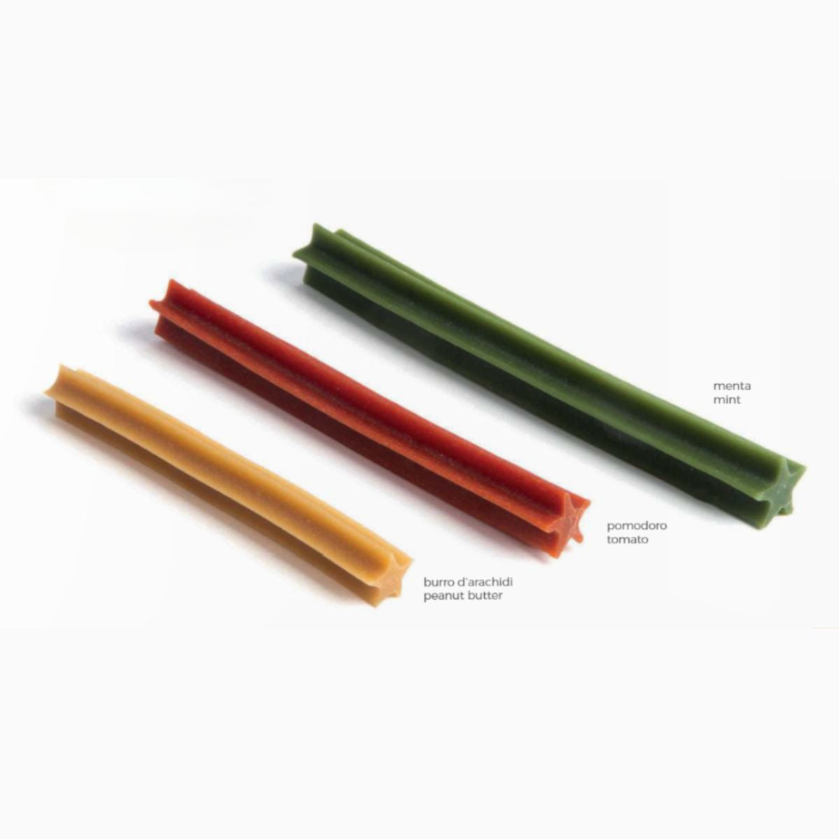 S (per cani fino a 10 kg): 10 pezzi da 120g/12cm, M (per cani fino a 25 kg): 5 pezzi da 100g/15cm, L (per cani oltre a 25 kg): 3 pezzi da 110g/18cm